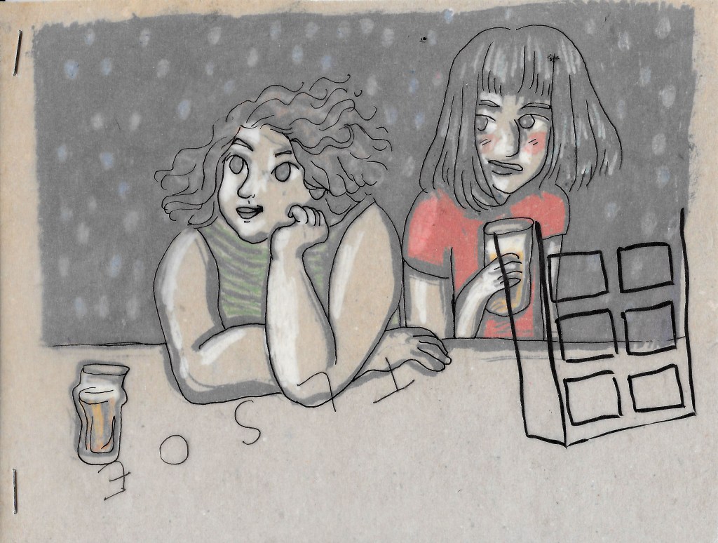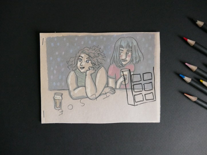 October 19, 2018September 4, 2022 Zoé Véricel Inktober 2018 #11 au bar, 11,3×14,7cmillustration montée avec un volet en calque Related