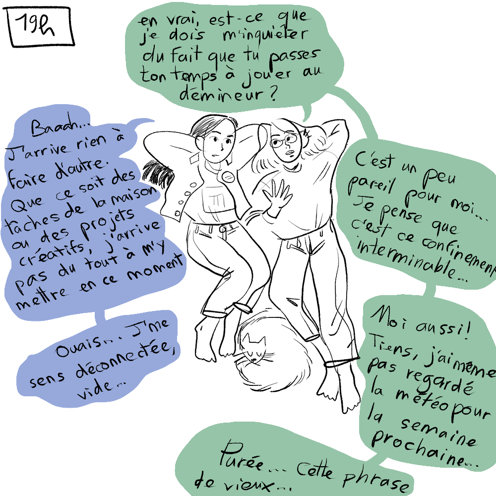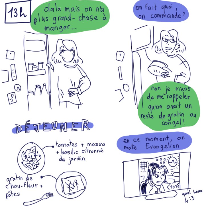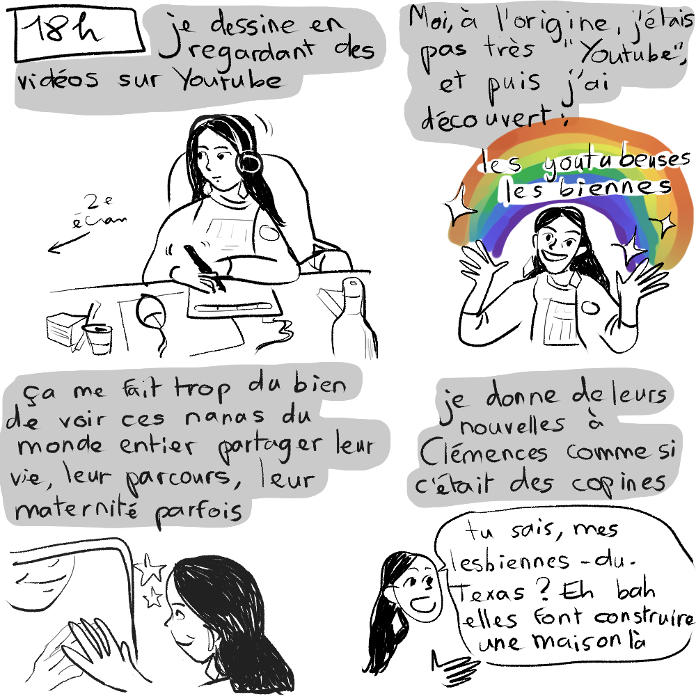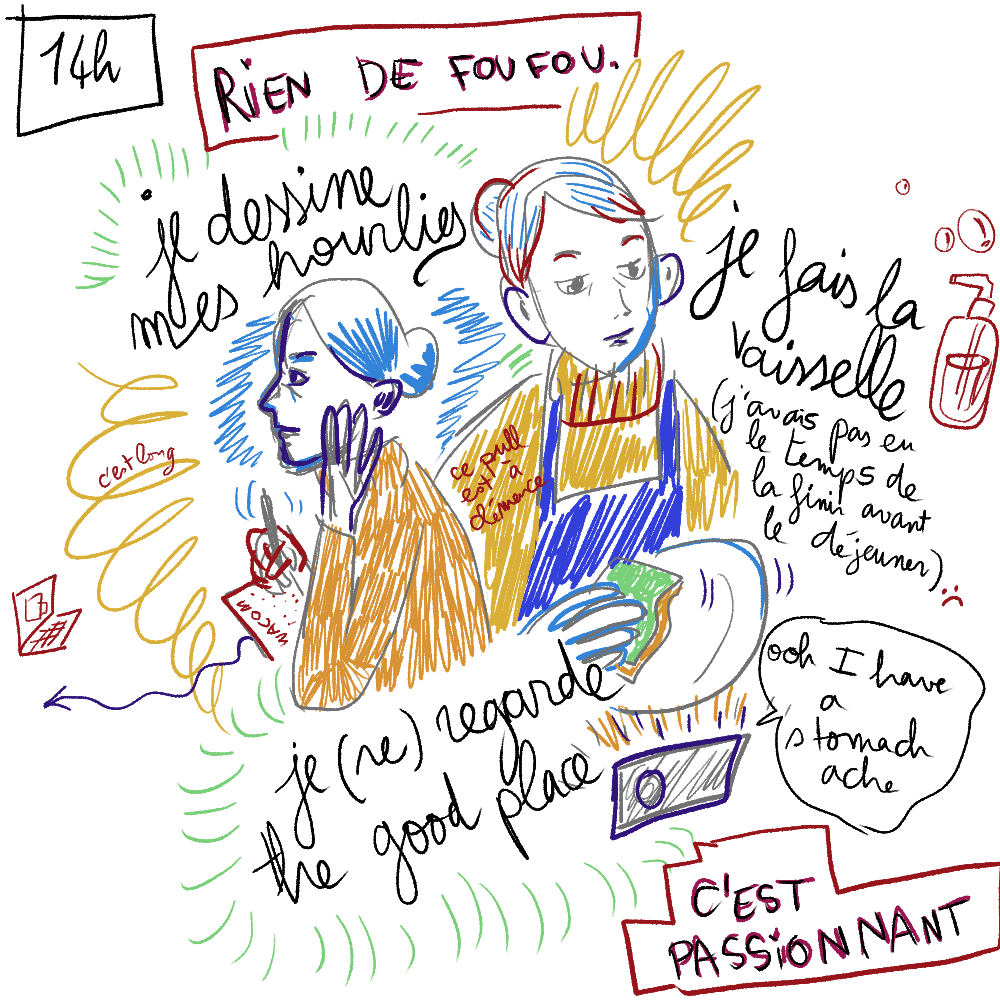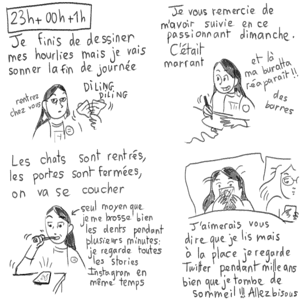 Le principe des Hourly Comics, c’est de faire une petite BD par heure, sur toute une journée. Normalement il y a des jours dédiés à ça, où tout le monde fait ses hourlies de concert, mais comme je loupe toujours le coche, j’ai décidé d’en faire en autonomie, comme ça, en ce dimanche 2 mai 2021. C’était aussi l’occasion d’étrenner Clip studio paint, un nouveau logiciel de dessin, donc si vous me voyez utiliser plein d’outils différents, c’est pour ça : je teste.