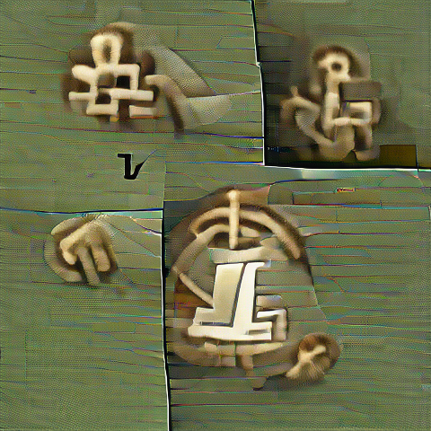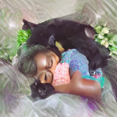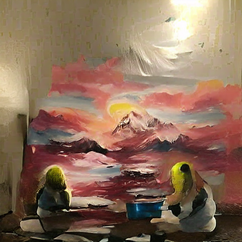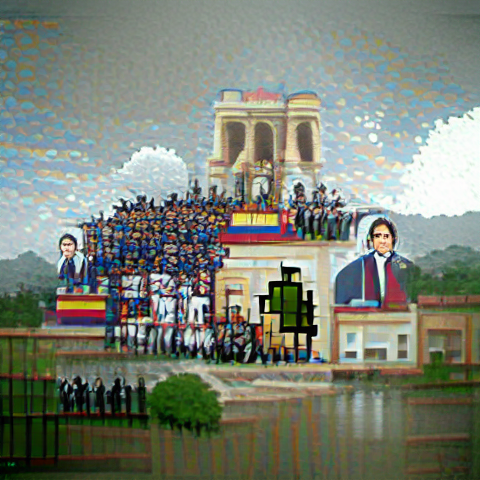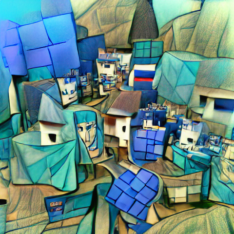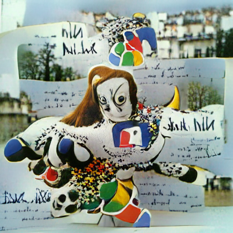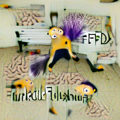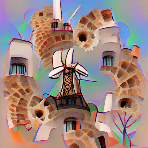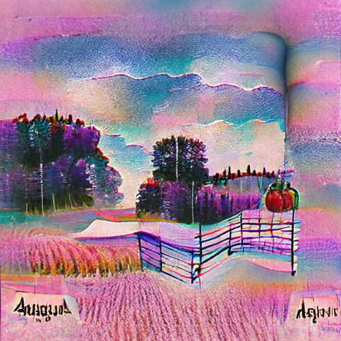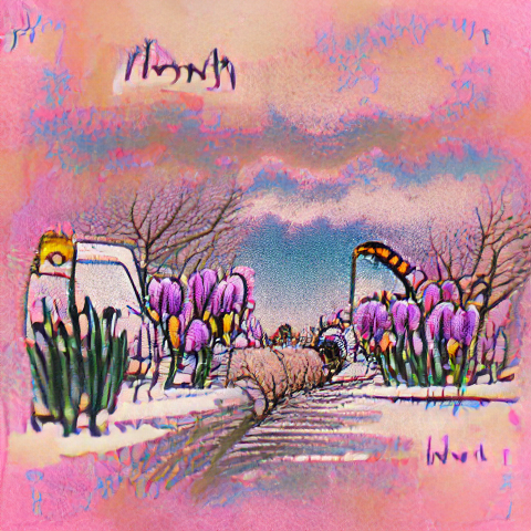 Par défaut, le programme nous montre son travail toutes les 50 itérations, et ne s’arrête de mouliner que si on lui demande. En général je préfère lui donner un nombre d’itérations défini, comme ça je le laisse tourner sans m’en occuper, et j’ai une notification quand c’est fini. Pour donner une idée, 500 itérations permettent d’avoir une image déjà assez développée, c’est suffisant pour savoir dans quelle direction l’IA est allée. 1000 itérations, et on a une image mieux définie, plus précise dans ses intentions. Parfois, j’ai laissé l’IA monter jusqu’à 3500 itérations, mais guère plus, parce que tous ces calculs prennent leur temps et que j’ai toujours été trop impatiente de tester mon idée suivante. Même si on a des images plus précises, moins brouillon à partir de plusieurs centaines d’itérations, j’ai tendance à bien aimer aussi les images du début, à 50 ou 100 itérations. Elles semblent peintes à gros coups de pinceau, elles ont du caractère, parfois je les trouve mieux que l’image “finale”.