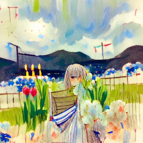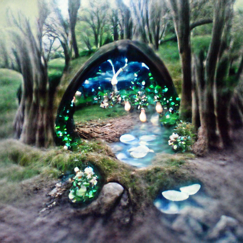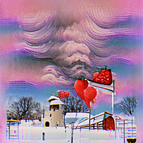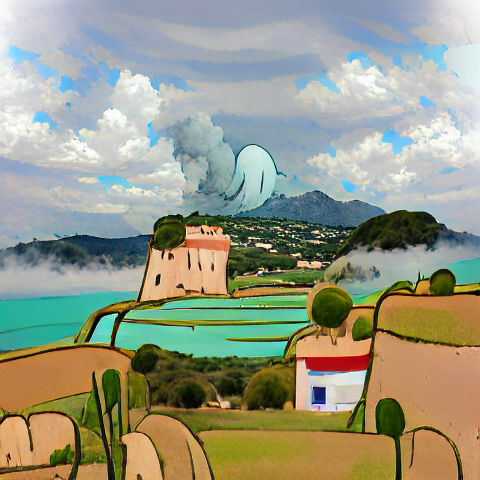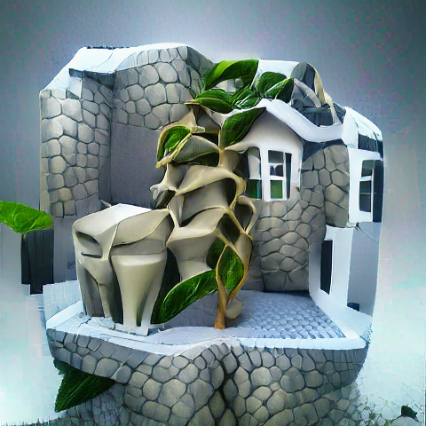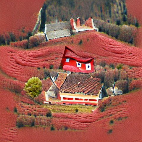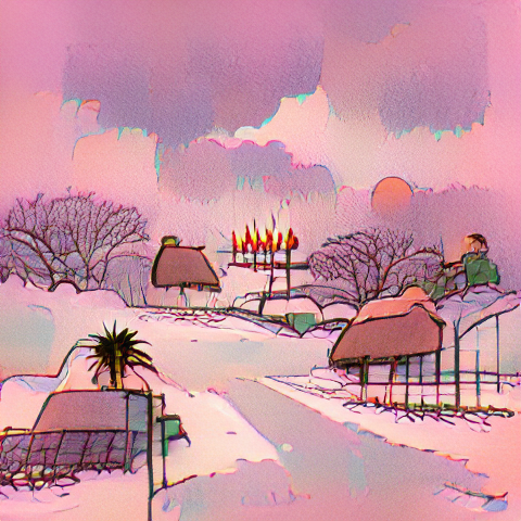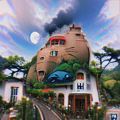Ci-dessus, un exemple de prompt que j’ai laissé tourner longtemps, environ 3500 itérations. J’avais donné comme sujet “Ghibli house” et je crois que c’est l’un de mes résultats préférés. Il y a un feeling “photo argentique” que j’adore.