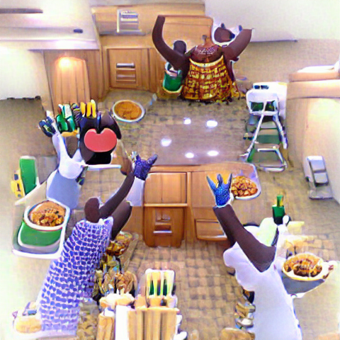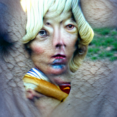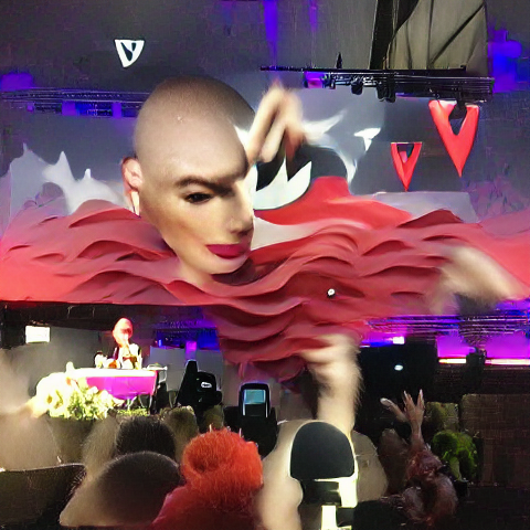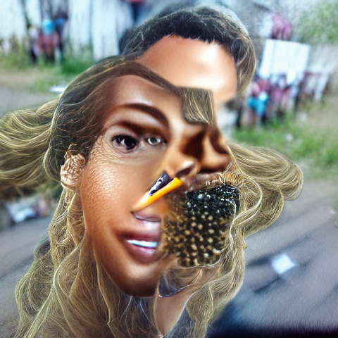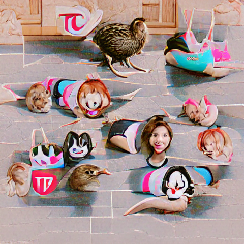 Demander des figures humaines est toujours un peu compliqué et on s’expose à des résultats assez flippants. En plus de la décontruction des corps, j’ai l’impression que l’IA nous colle souvent des éléments animaux : Beyoncé a l’air d’avoir un bec de canard, les membres du groupe Twice ressemblent à des hamsters (et il y a un genre de poule/ kiwi qui s’est invitée). Quant à Britney Spears, euh… L’IA a retenu UN truc apparement : le NOMBRIL. Du coup, elle en a mis PLEIN. Désolée Britney.