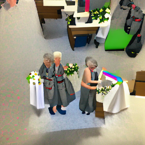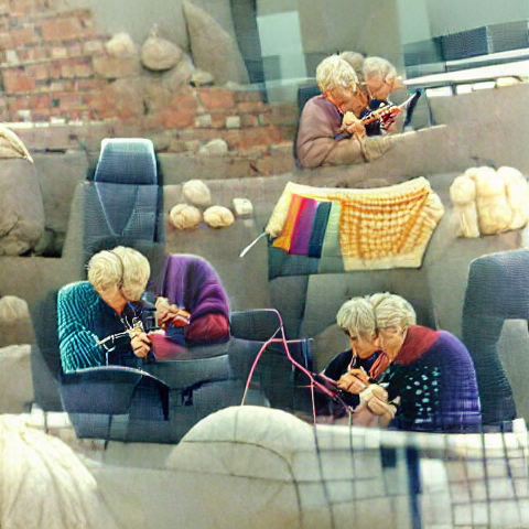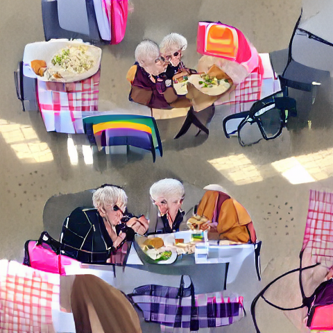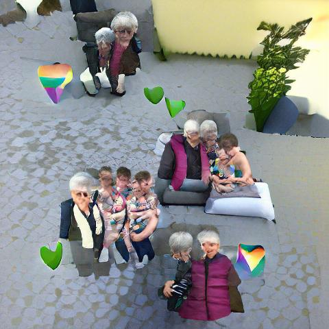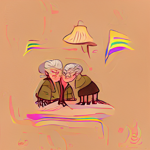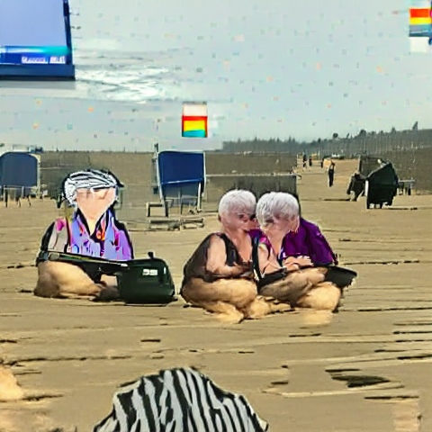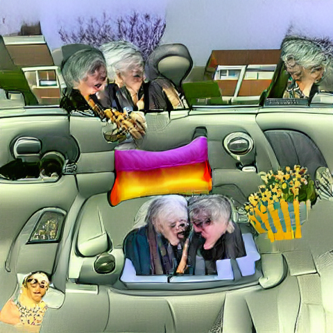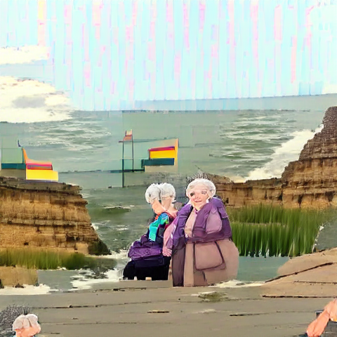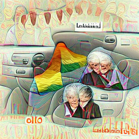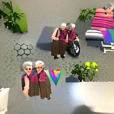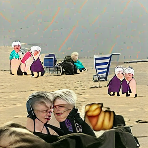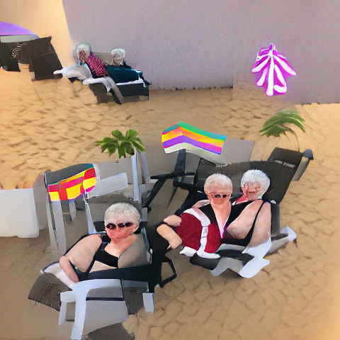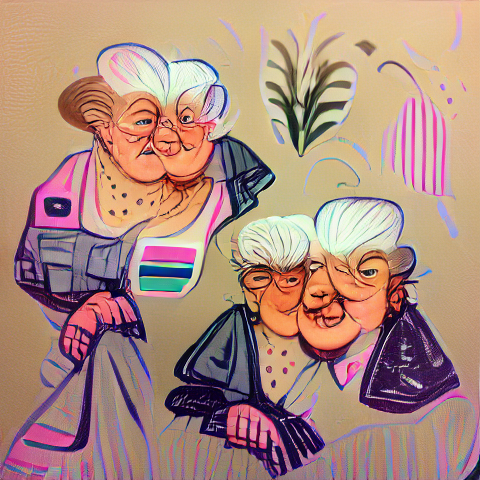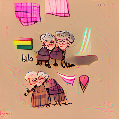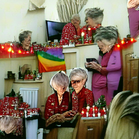 Pour finir, ce dernier projet où j’ai lancé à la chaîne des variations du même sujet : “old lesbians”. Puisque j’ai à ma disposition un outil qui génère des images qui n’existaient pas précédemment, je lui ai demandé les images qu’il me manque dans ma vie : des images de lesbiennes âgées, ce happy end qu’on voit si peu, cet avenir qu’on a, du coup, du mal à imaginer. J’en ai fait plein de variations, un peu comme les Martine : vieilles lesbiennes en voiture, vieilles lesbiennes à la plage, vieilles lesbiennes avec des chats, vieilles lesbiennes heureuses.