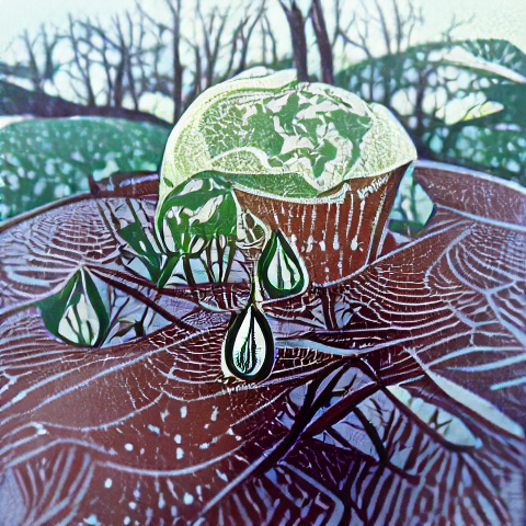 On peut ajouter des indications pour guider l’IA, par exemple “watercolor” pour un rendu aquarelle, ou “render” pour viser un rendu 3D plus réaliste. J’ai testé de lui demander de la linogravure, de la gouache, de l’encre, des tracts, un rendu “roman graphique”… J’ai mis ici ce type d’indications entre parenthèses pour plus de clarté. Vous pouvez faire clic droit/ ouvrir l’image dans un nouvel onglet pour voir les images en plus grand.