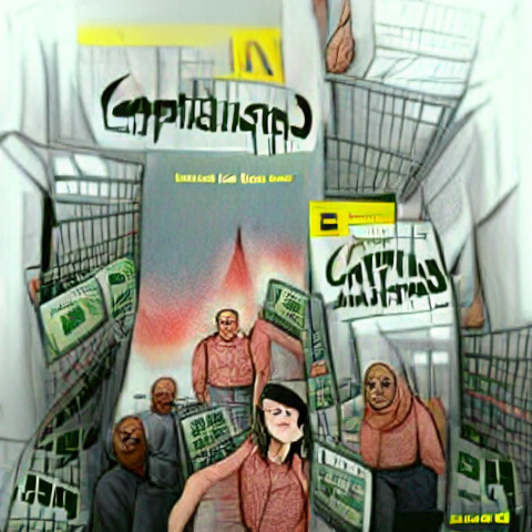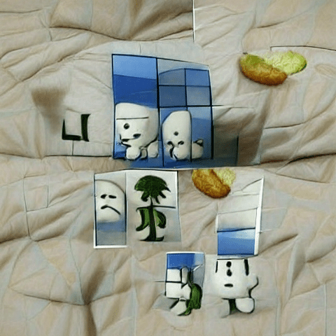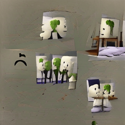 Et je suis désolée de vous annoncer que l’IA connaît Loss. En donnant comme sujet ce seul mot (pas d’indication du type “comic”, “meme”), on a bien la structure en 4 cases et on peut plus ou moins reconnaître le motif “sujet seul, sujet + quelqu’un derrière un comptoir, 2 sujets debout, sujet + quelqu’un d’allongé”. Voilà voilà.