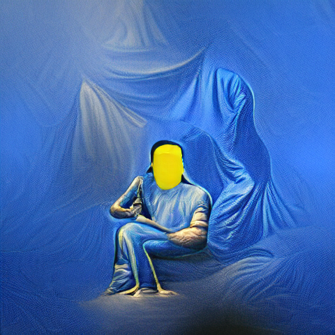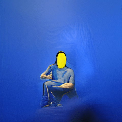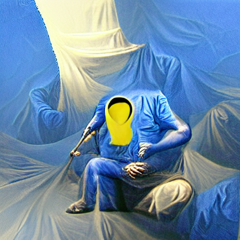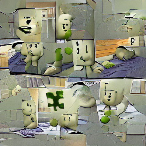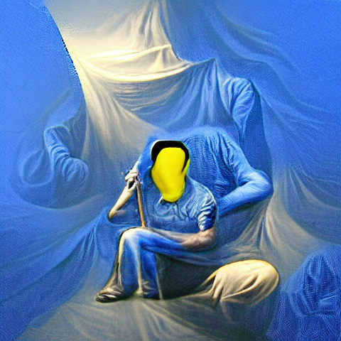“blue person on a yellow background”, 4 différents niveaux d’avancement. Bon, c’est devenu “blue person with a yellow face on a blue background” mais ça me va aussi. D’ailleurs le fond se met petit à petit à se teinter de jaune, peut-être que l’IA s’est rendu compte de son erreur et a tenté de rectifier le tir.
