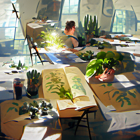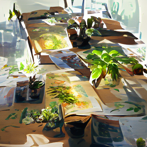 Exemple d’un même sujet à trois différents niveaux d’avancement. On va vers un résultat de plus en plus réaliste, mais encore une fois j’aime aussi beaucoup le résultat du début. Le sujet était : peaceful artist workshop with plants and a lot of sunlight.