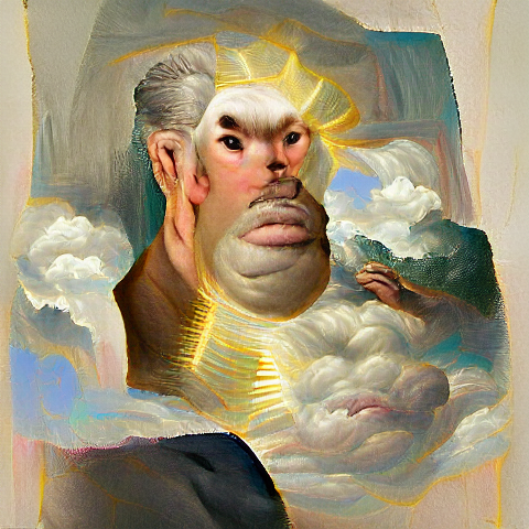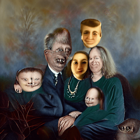Les algorithmes ne sont jamais neutres et on peut noter des biais dans les résultats. Une manifestation fréquente et flagrante est que lorsqu’il y a une figure humaine elle a par défaut presque toujours la peau blanche. Ce biais raciste est fréquent malheureusement. Ou encore, exemple ci-dessus, j’avais donné comme sujet à l’IA “portrait of the patriarchy”, m’attendant à obtenir l’archétype du vieux patriarche, mais j’ai vu apparaître des figures plutôt “féminines” : cheveux longs, rouge à lèvre, teintes roses. Elles avaient aussi des badges et les cheveux teints en bleu ou en violet… Oh mon dieu ! Des féministes ! Bah oui, qui est-ce qui parle le plus du patriarcat : les féministes, donc l’IA a considéré dans un magnifique contre-sens que les féministes incarnaient le patriarcat.