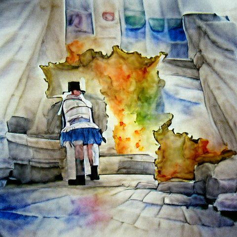Après les extraits de poésie, des paroles de chanson. J’ai testé avec “On brûlera” de Pomme, en français dans le texte d’où la récurrence du bleu-blanc-rouge (super…) J’avais donné comme indication en plus à chaque fois “watercolor”