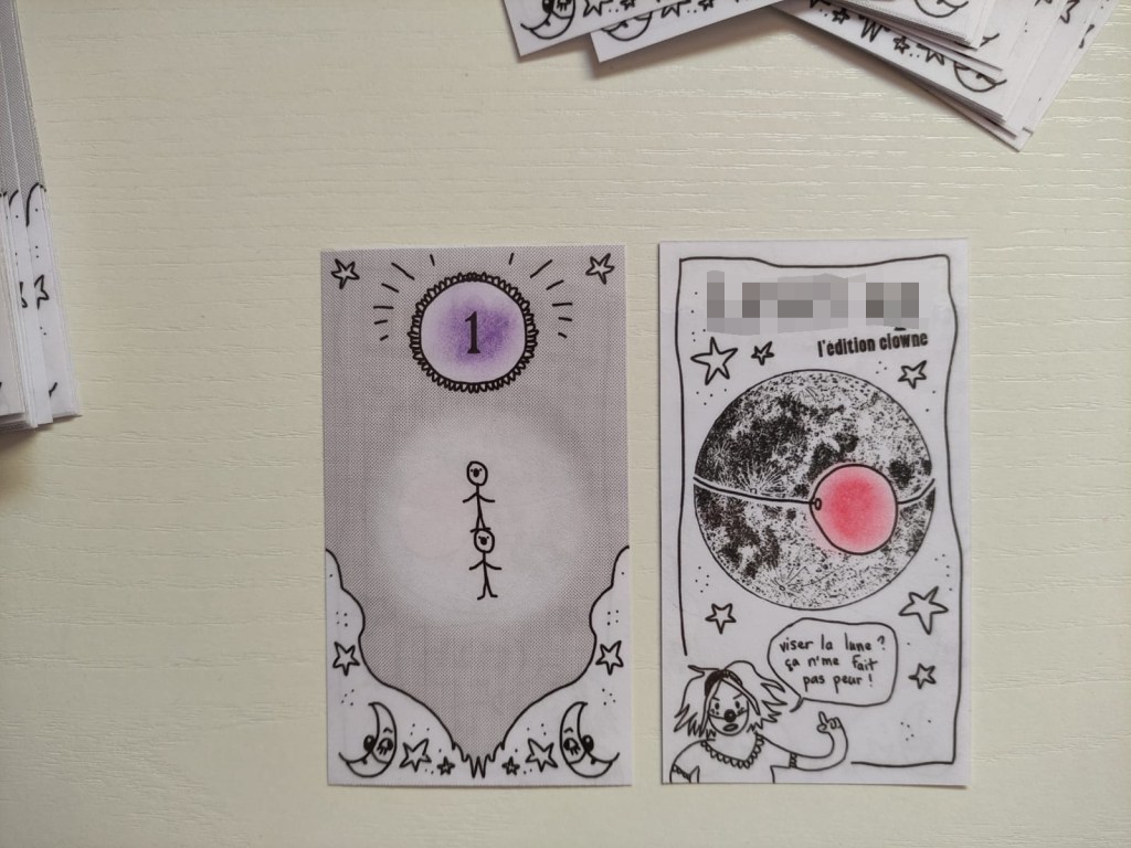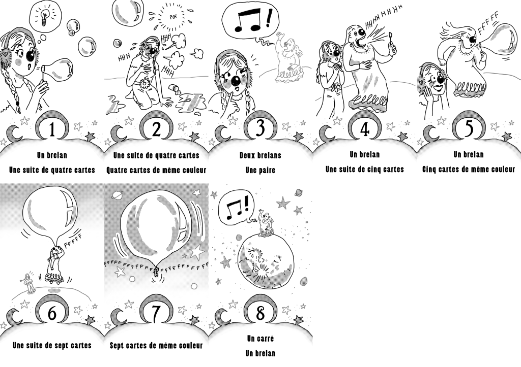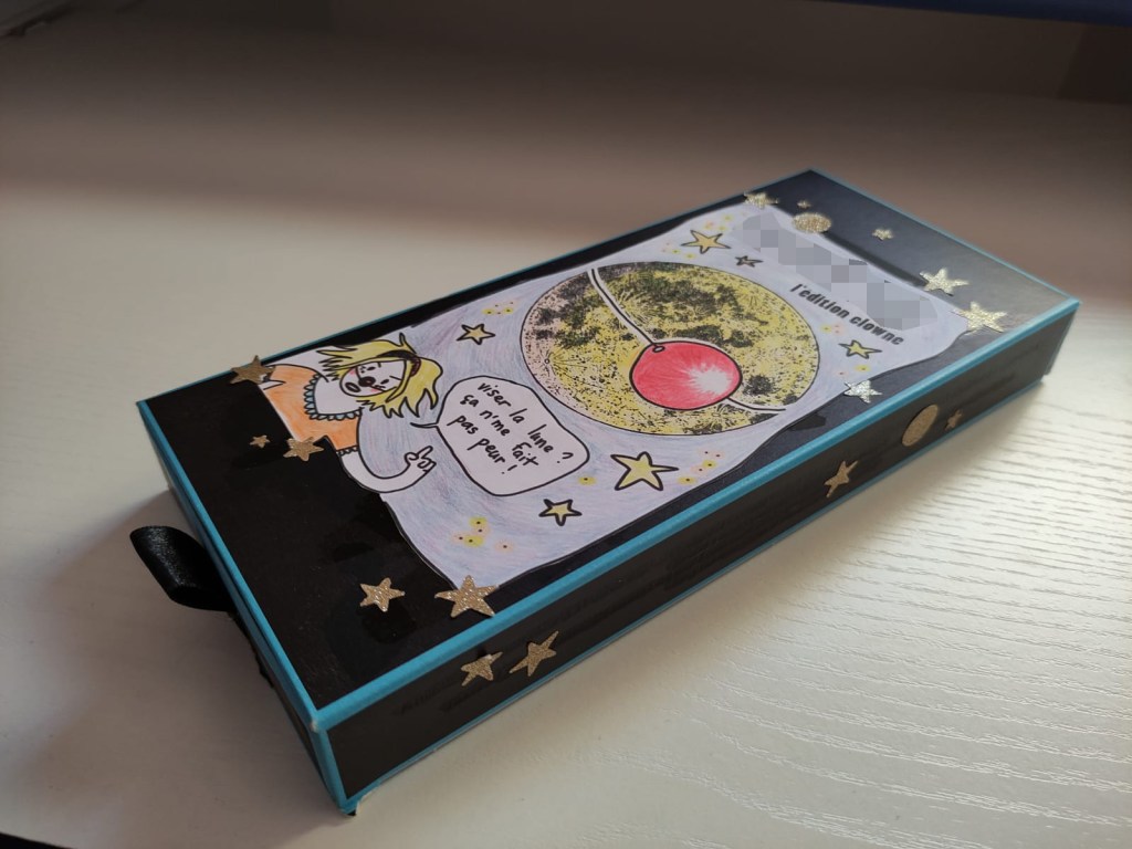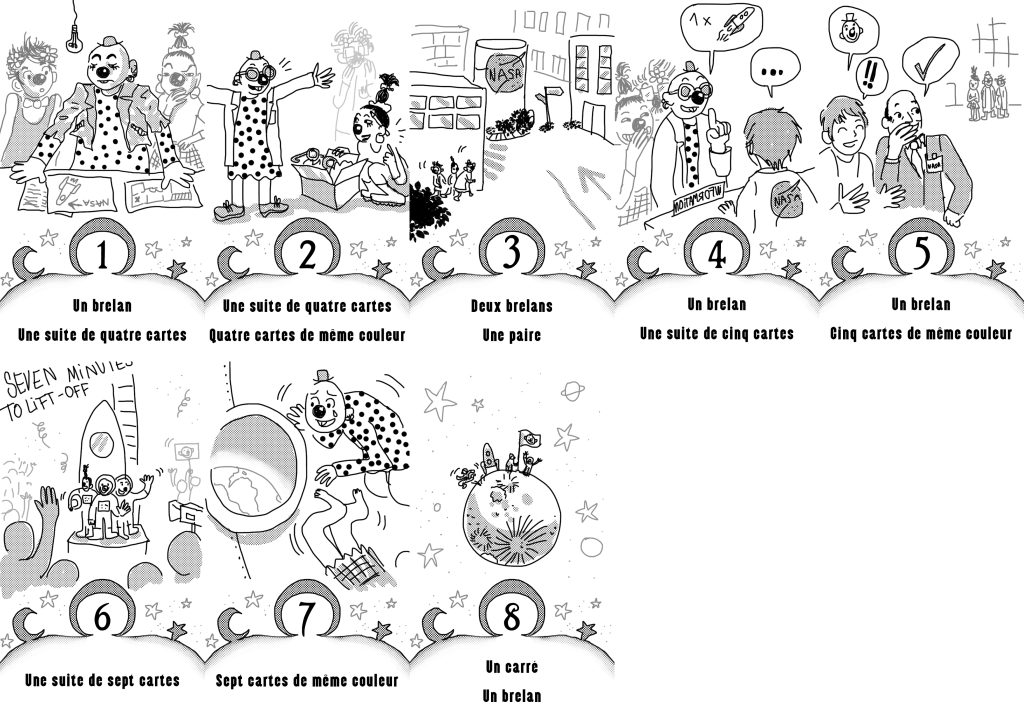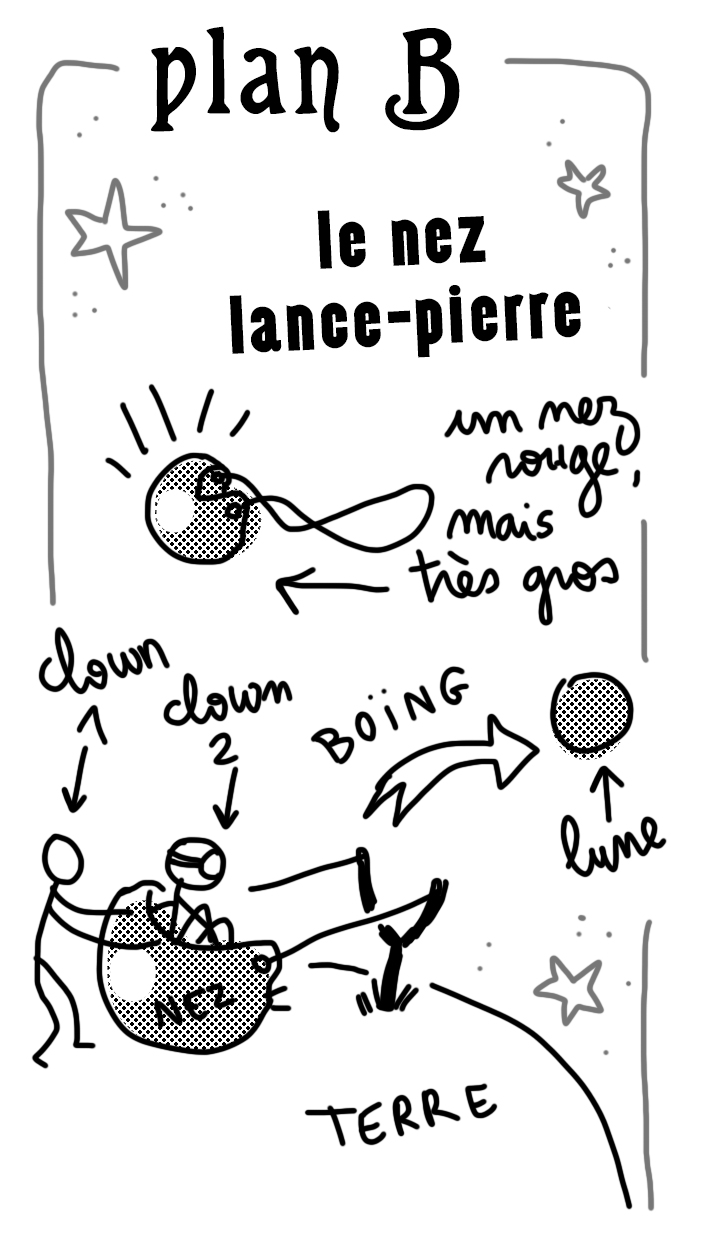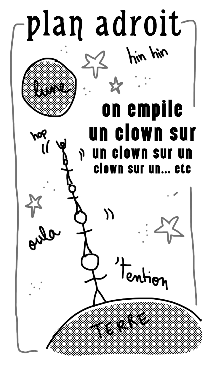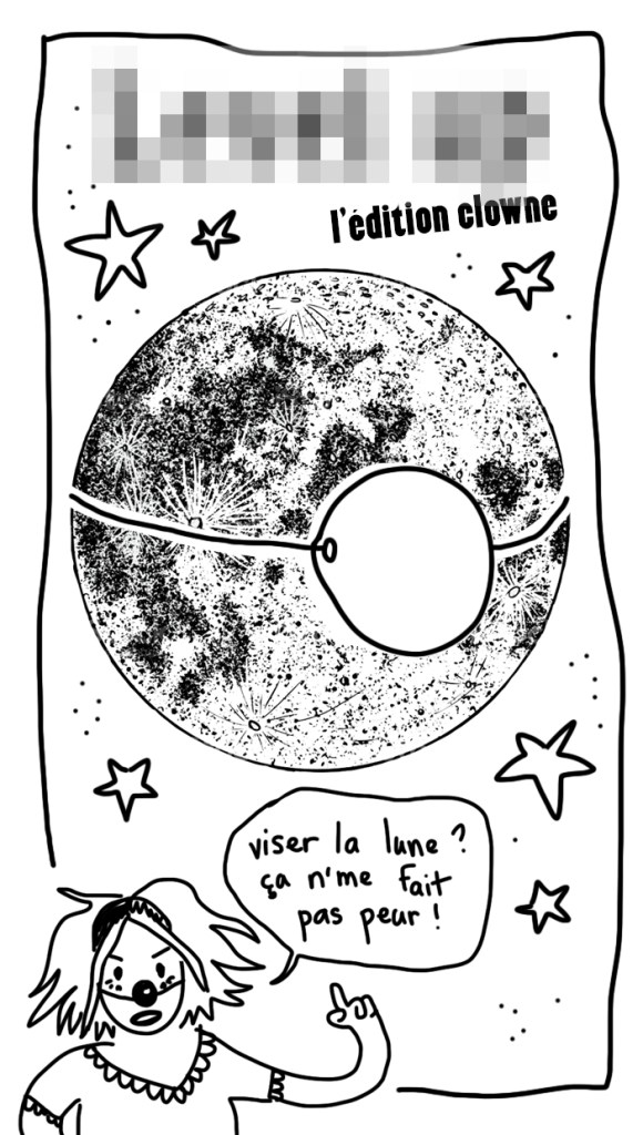 Version pirate d’un jeu de société dont on ne citera pas le nom, devenu introuvable (sauf à prix d’or) depuis qu’il n’est plus édité. Le but du jeu est d’atteindre la lune (on passe pour cela par plusieurs paliers) et dans ma version ce sont des clowns qui essaient d’aller toucher notre satellite préféré, par des moyens tous plus stupides les uns que les autres.