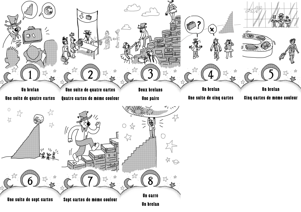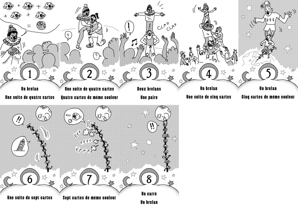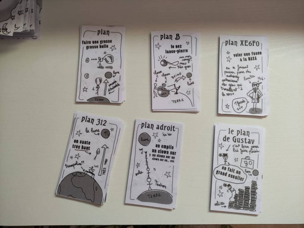 Ci-dessous, les 6 plans stupides géniaux en question (constituant le dos des cartes palier). Il faut choisir celui qu’on préfère en début de partie