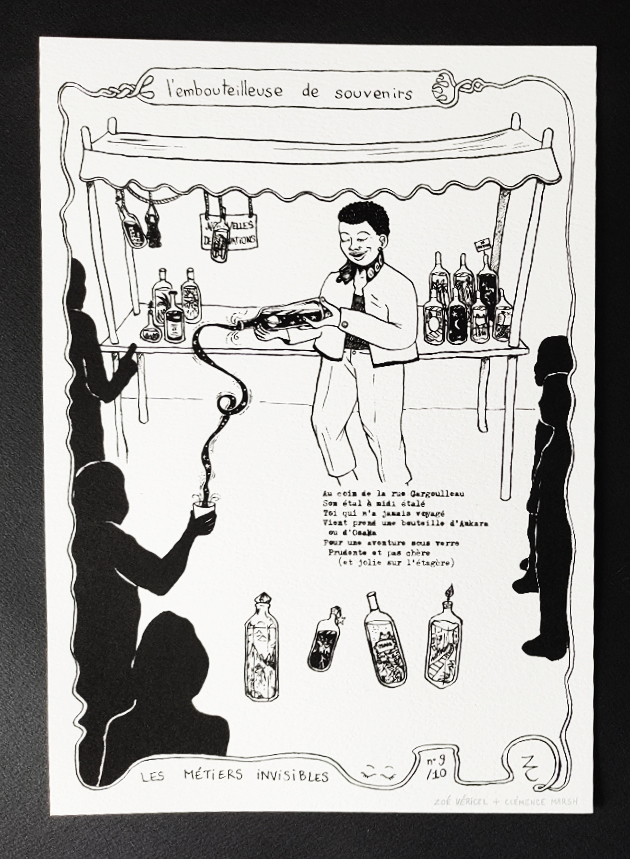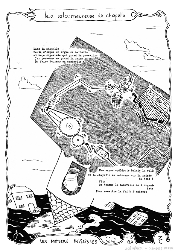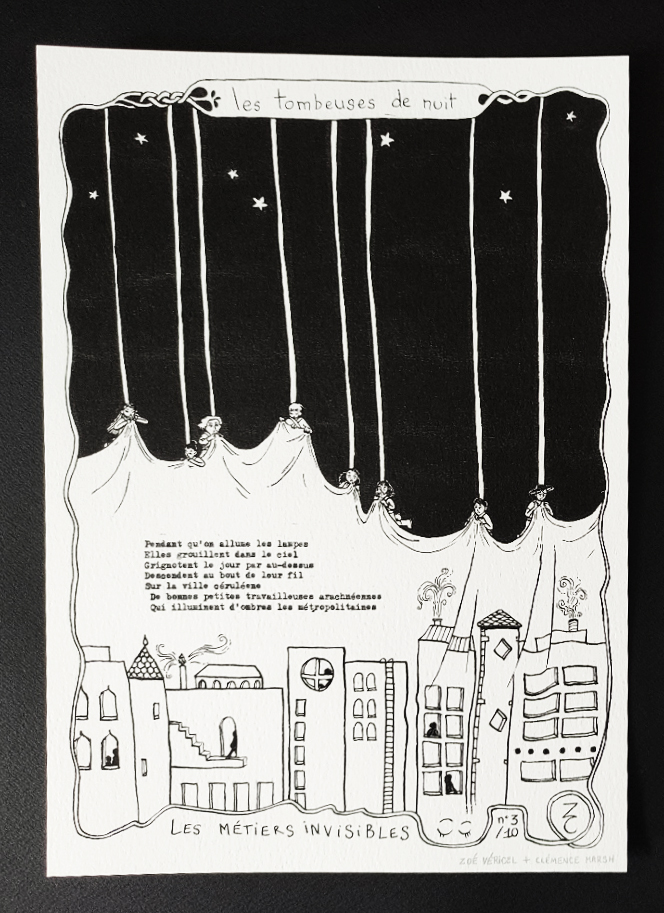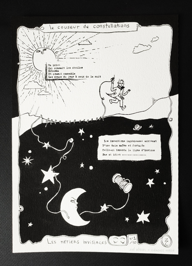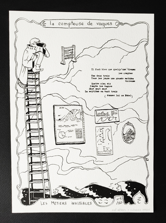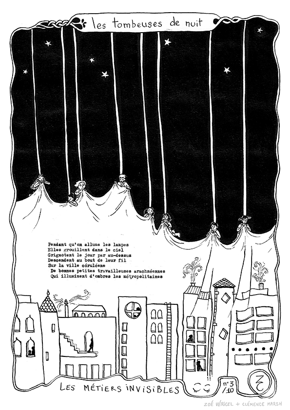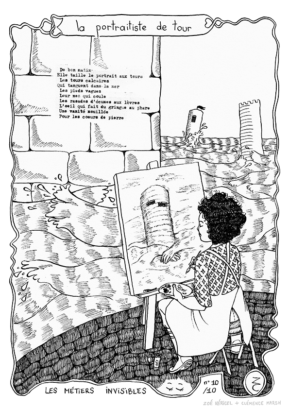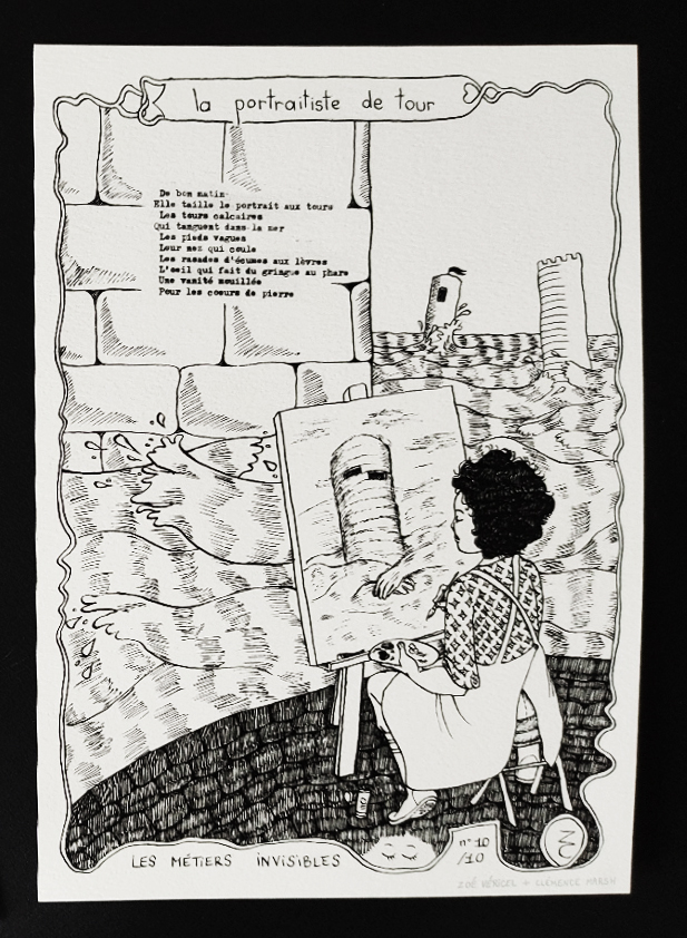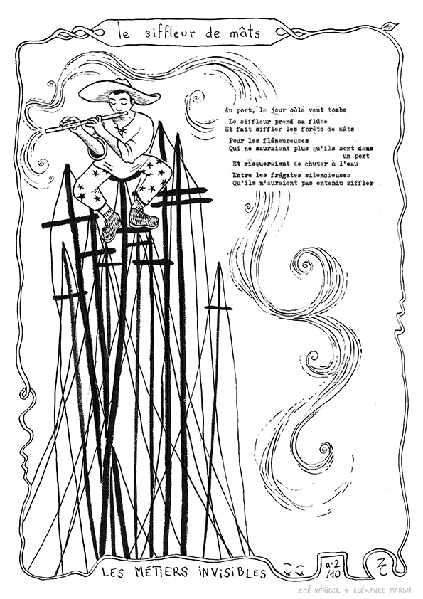 Les tombeuses de nuit, le siffleur de mâts, la compteuse de vagues… Autant de “métiers invisibles” pleins de poésie que Clémence a imaginés et tapés à la machine à écrire directement sur la feuille, avant que je dessine à l’encre de chine les illustrations autour de chaque texte.