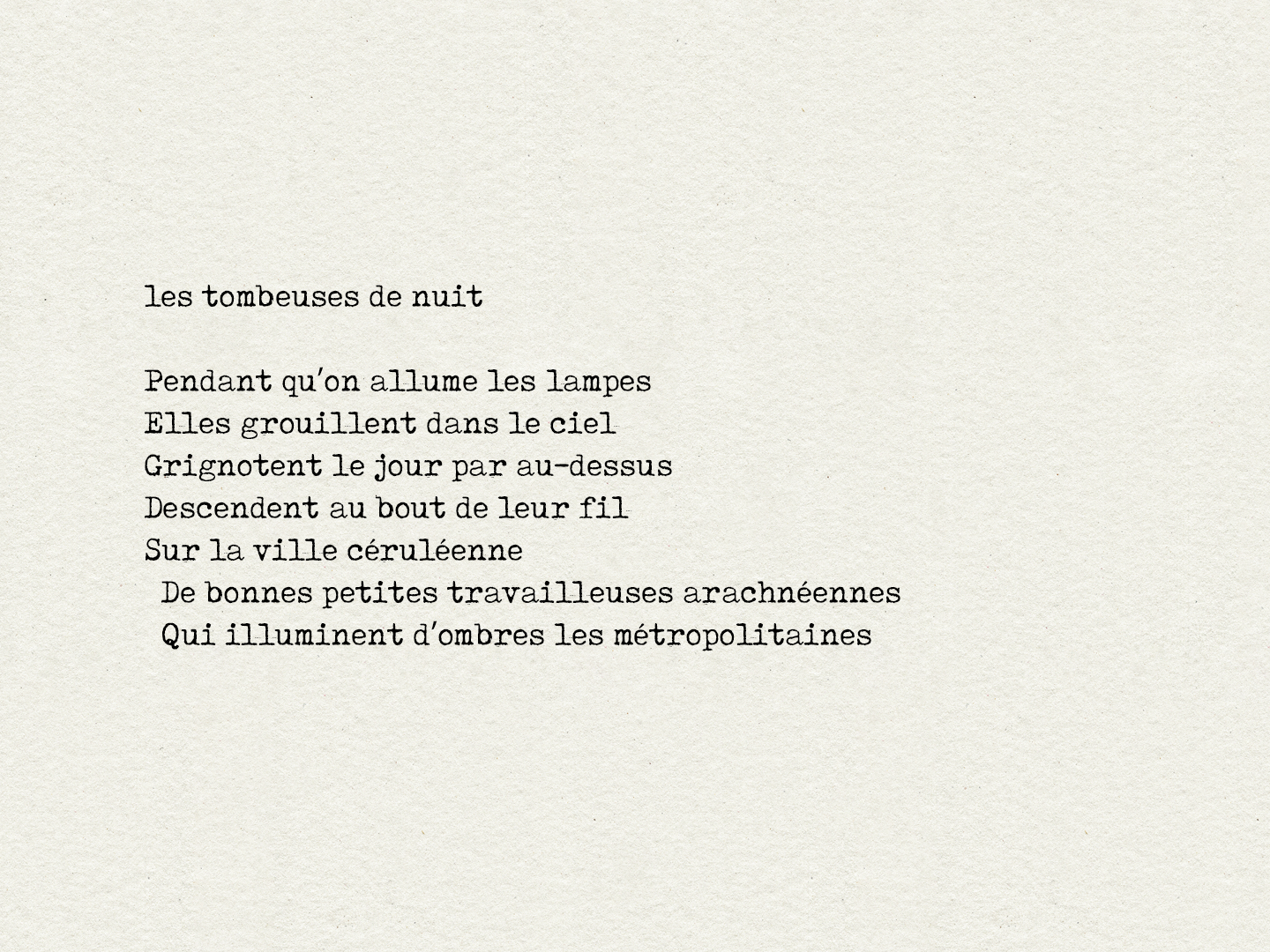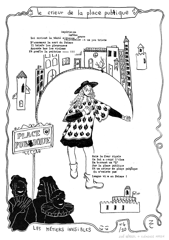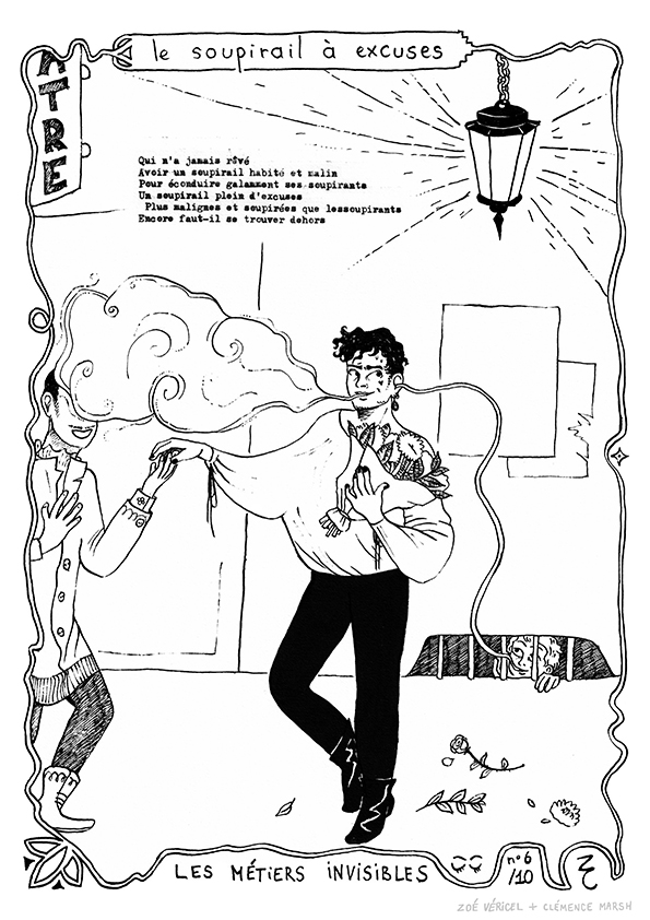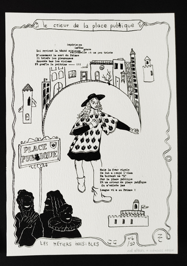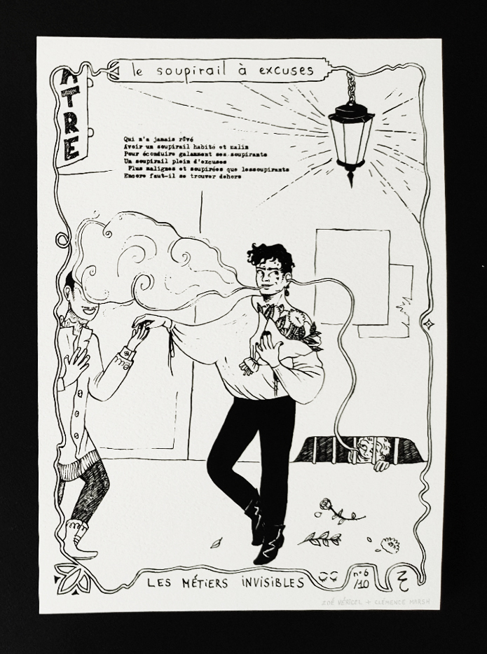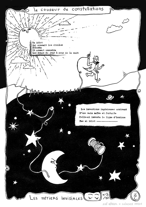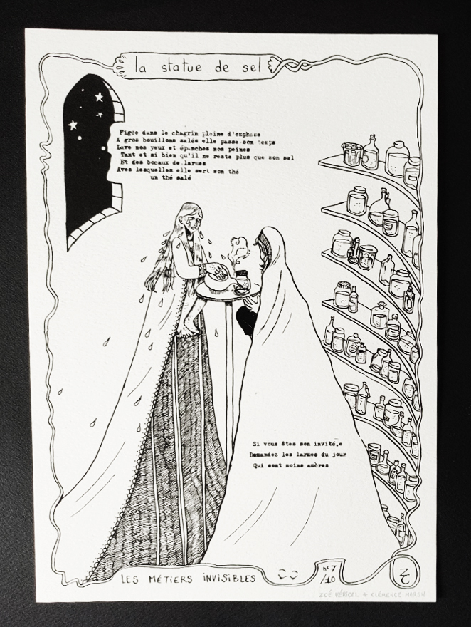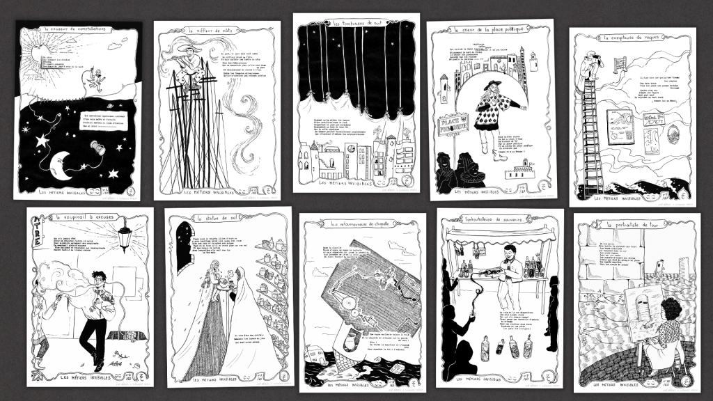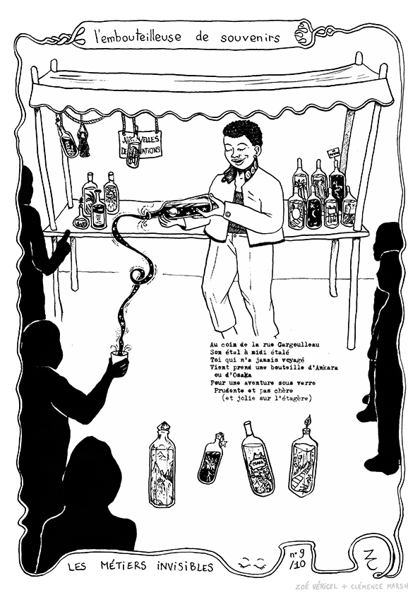 Les tombeuses de nuit, le siffleur de mâts, la compteuse de vagues… Autant de “métiers invisibles” pleins de poésie que Clémence a imaginés et tapés à la machine à écrire directement sur la feuille, avant que je dessine à l’encre de chine les illustrations autour de chaque texte.