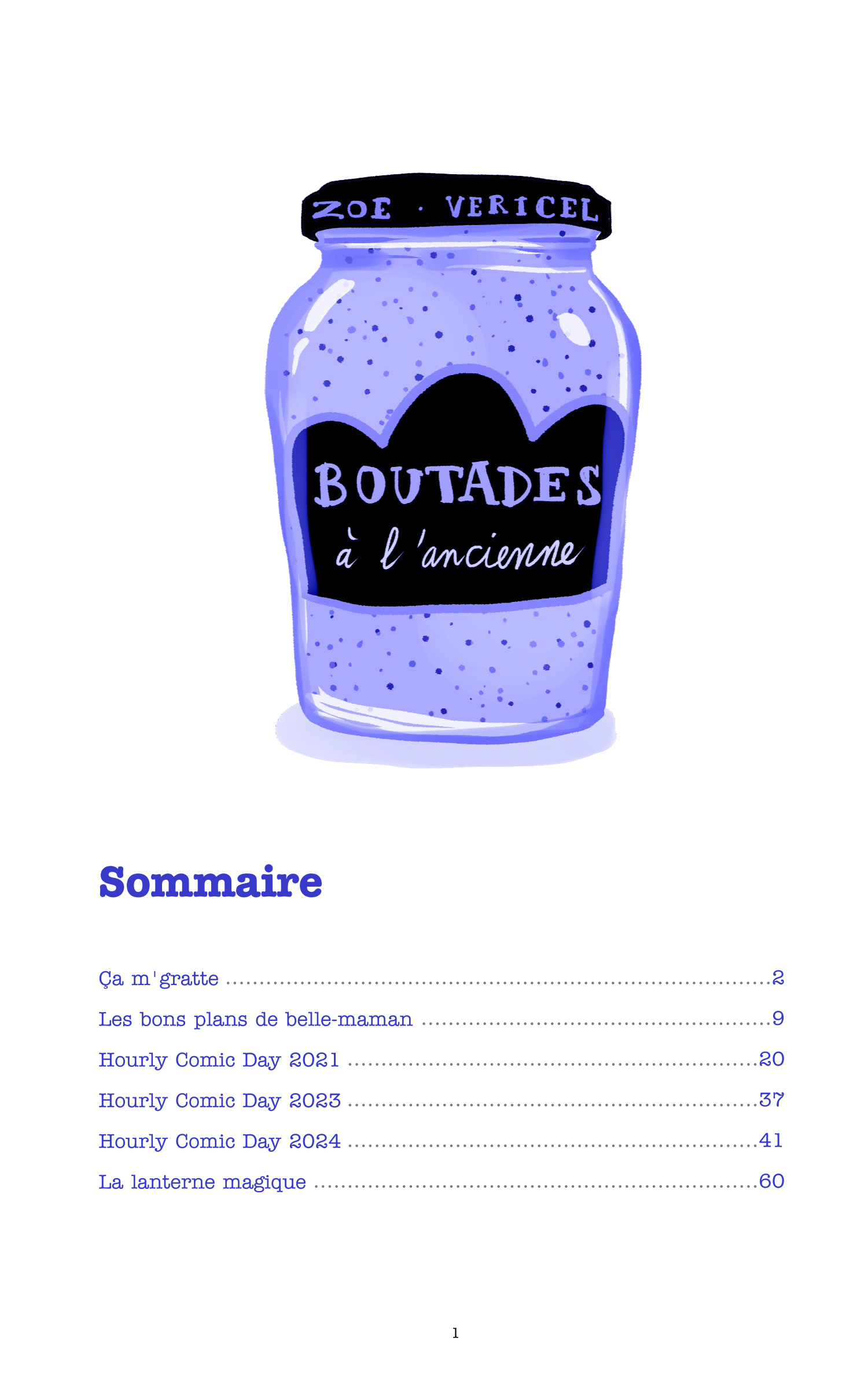 “Boutades à l’ancienne” est un recueil de BDs faites entre 2020 et 2024. Toutes les BDs sont écrites et dessinées par Zoé Véricel sauf “les bons plans de belle-maman” qui est écrite par Clémence Marsh.