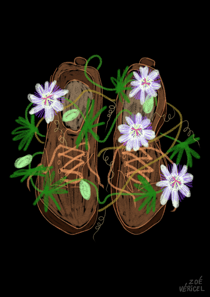 La baigneuse et l’épitaphe parle d’un deuil, mais dans une langue extraordinairement vivante. Clémence dit : Je propose une grammaire d’absences, de drôles de rêves et de contes. J’ai voulu m’appuyer sur cet aspect onirique, ne pas être dans le pathétique, et j’ai donc d’abord travaillé avec ces couleurs très vives, sur des images où le végétal, l’éclosion sont omniprésents.